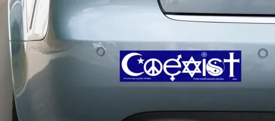 On principle, I am against bumper stickers. I think they ruin the pristine look of a car with something that looks generally gaudy and embarrassing. My parents’ first SUV had one that said something to the effect of “Star Student at [Insert Elementary School Name Here]”. I still contend that sticker applied to me and not my younger sibling. Even the sticker on my back windshield, which my friends placed on as part of an ongoing joke about me hitting a bear with my car, I don’t particularly enjoy. By far the most prevalent bumper sticker I’ve seen is ”COEXIST” sticker.
